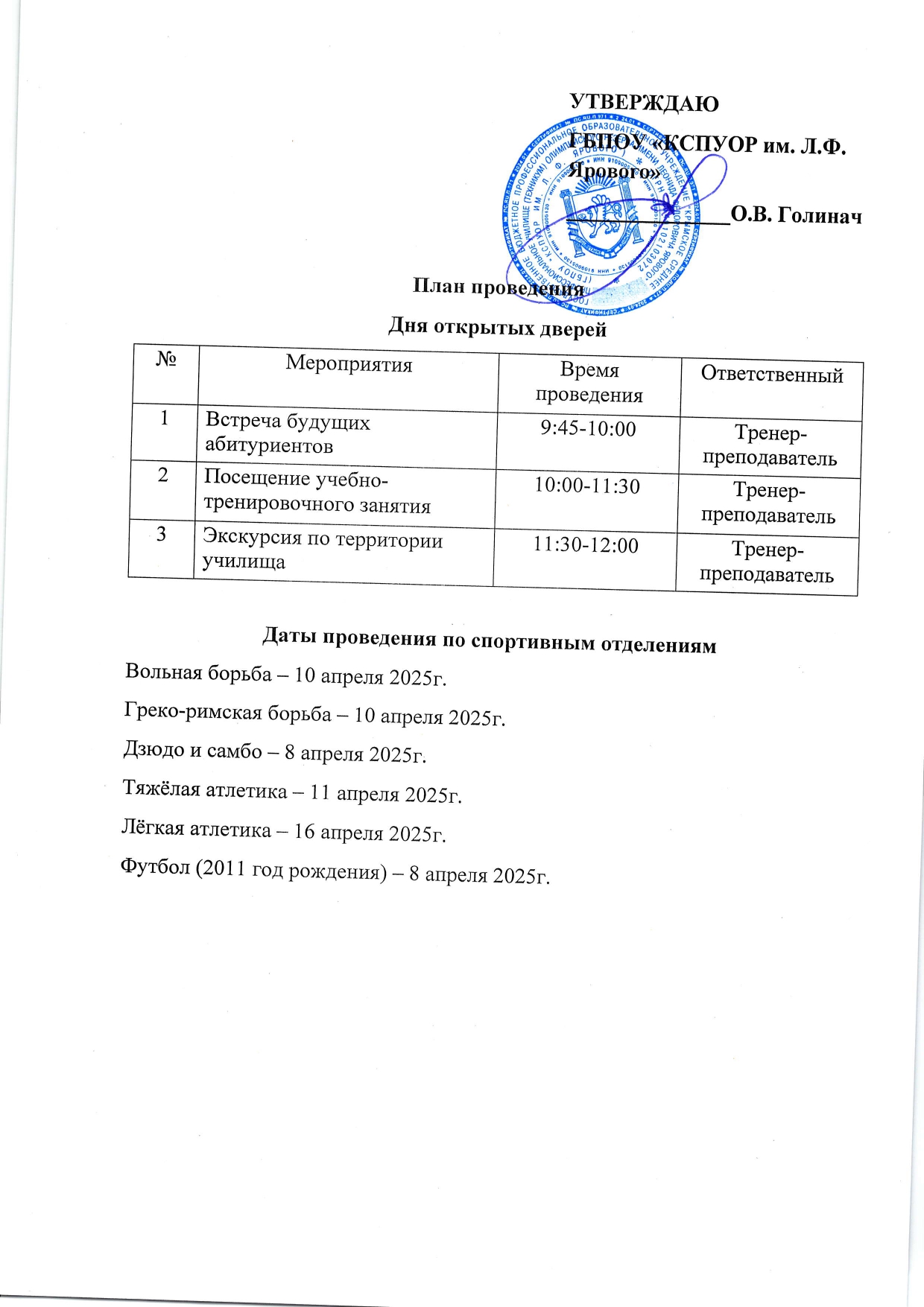Училище олимпийского резерва приглашает ребят занимающихся спортом на День открытых дверей с 8 по 16 апреля 2025г.admin01.04.2025Новости Пред. Запись "Созвездие Чемпионов" След. Запись Приглашаем на просмотр футболистов 2011 года рождения, который состоится в субботу, 14 июня 2025 г. Начало в 10-00.